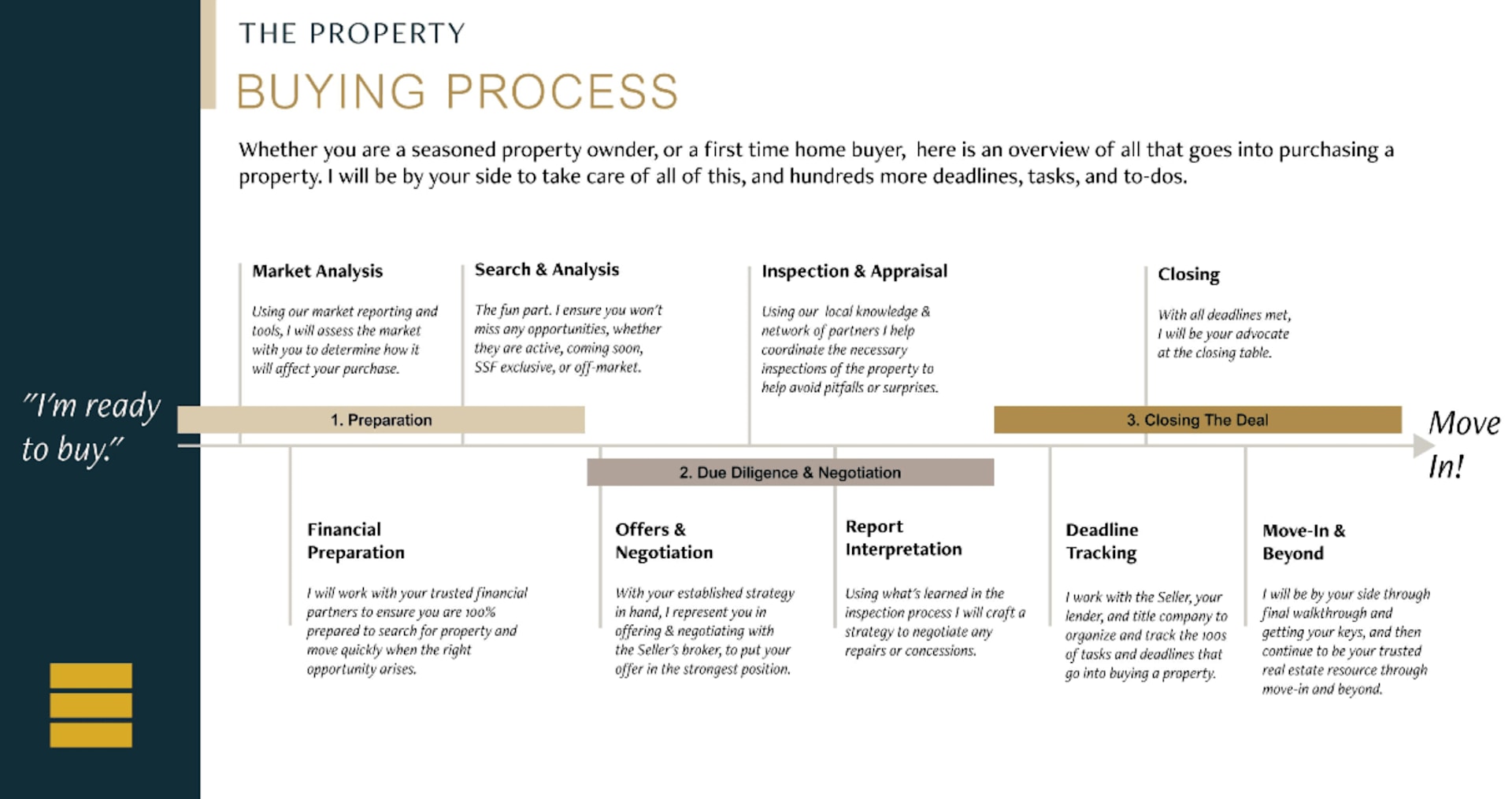 First, let's plan a consultation. I want to understand your timeline, budget, the factors unique to your situation as a buyer, and your expectations for the property. With that information, I can best prepare you for the purchase process, negotiating properly on your behalf and setting you up for success. For example, are you financing, doing a 1031 exchange, working with a local attorney? Do you expect rental income on your vacation home? It's important for me to understand all of this before we begin the search.