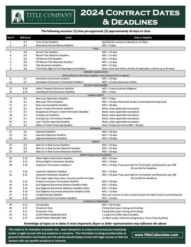 Observing the dates & deadlines set forth in the contract and agreed upon by all parties is critical. Here is an example provided by Title Company of the Rockies: